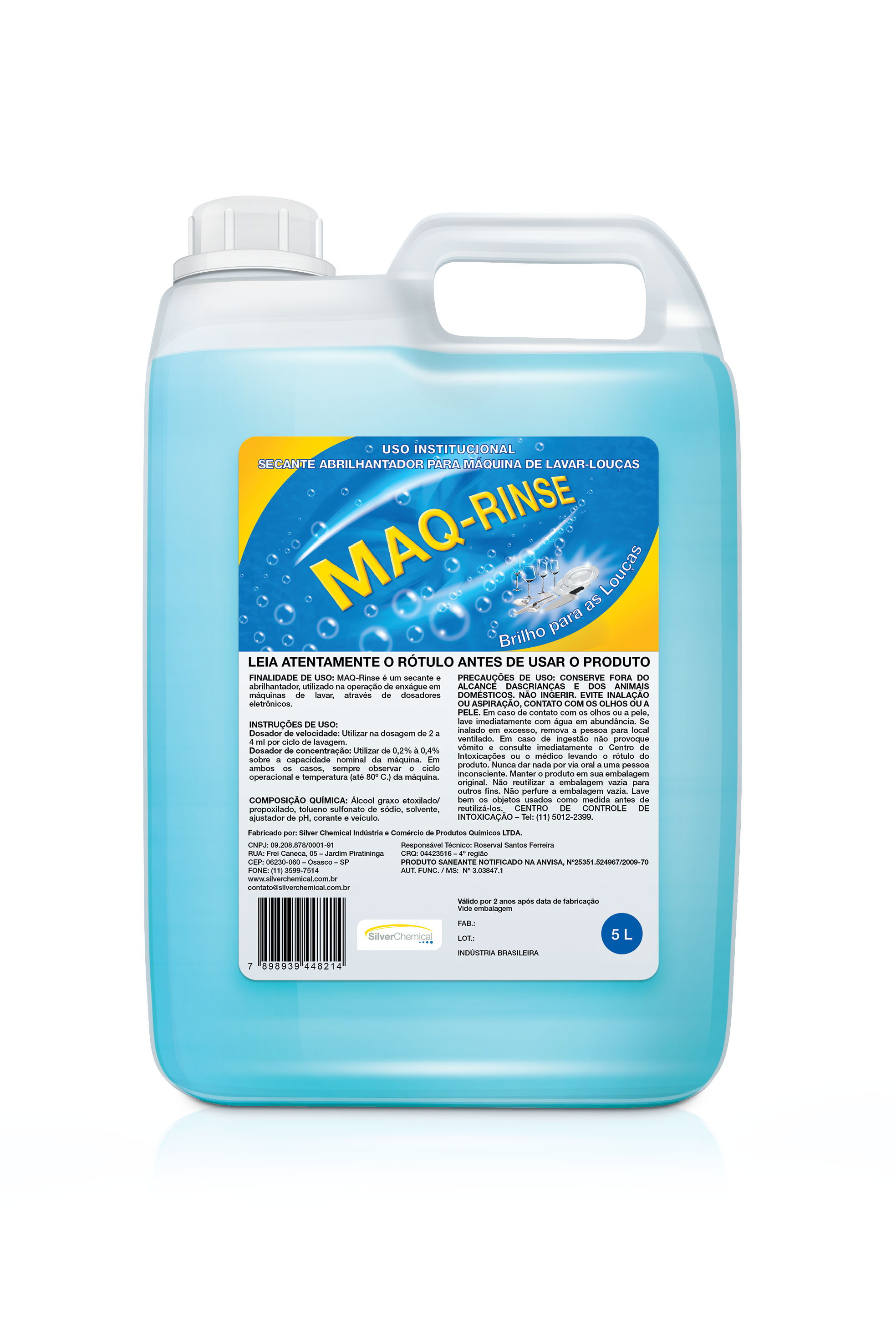 Secante e abrilhantador de louças, utilizado na operação de enxágue em máquinas de lavar, através de dosadores eletrônicos.