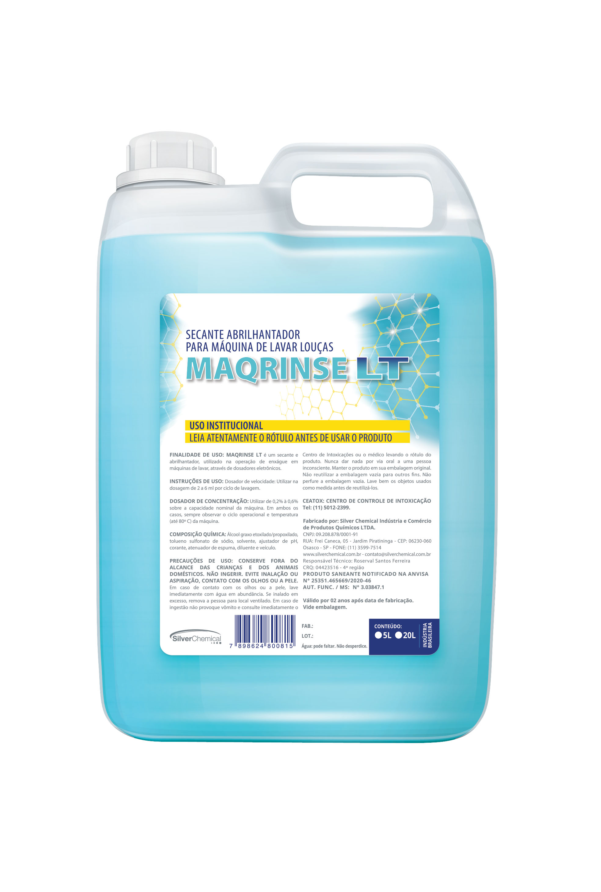 Secante e abrilhantador, utilizado na operação de enxágue em máquinas de lavar, através de dosadores eletrônicos.